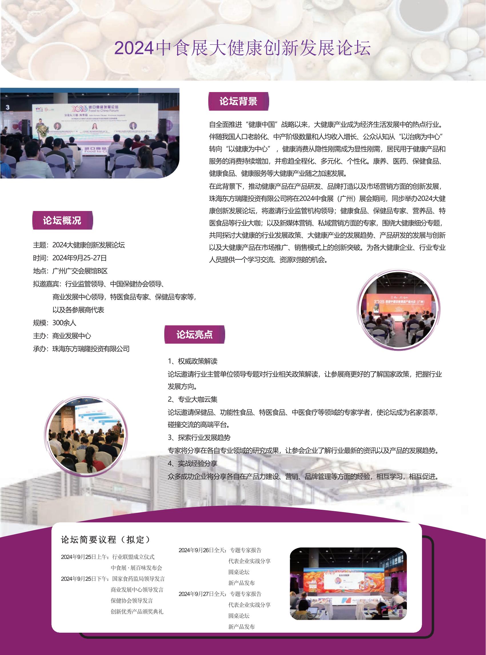中食展·展百味大健康食品展是由商业发展中心主办,珠海东方瑞隆投资有限公司承办的专业展览活动。展会将围绕大健康主题设置控糖、隆脂、肠道营养、美容抗衰等专题,为保健品、健康食品、特医食品等大健康企业打造一个展示自身产品、品牌、技术和服务的平台,同时也为行业内专业人士提供一个交流、学习以及合作的机会。